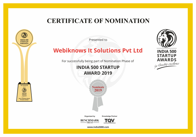 Since our jump-start, Webiknows has experienced a tremendous amount of achievement and backing from everybody and today we are absolutely thrilled to have been nominated under India 500 Startup Award of India 5000 Awards. It feels surreal that we are finally being appreciated and noticed for our hard work. We at Webiknows are honored and humbled for the nomination and its achievements like these and encouraging words from our clients, friends, and family that keeps us going. We’d like to express gratitude towards India 5000 for thinking about us among other esteemed new companies. We've had the chance to team up with many fine and smart clients and we would like to thank them for having chosen to work with us because without them we wouldn't have been here.